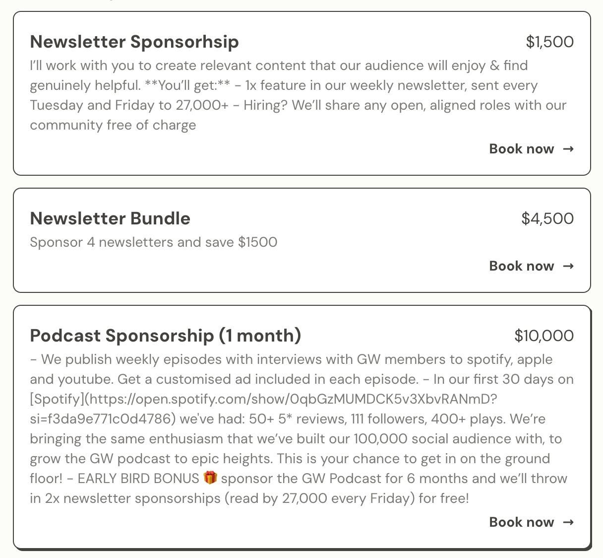 Milly minimized this second part with sponsorships. She pursued Notion for two years, reaching out through four different contacts before landing the deal. Notion renewed. Other partners followed: Canva, Lovable, Gamma, Zapier. Newsletter placements go for $1,500 each. Podcast sponsorships run $10,000 per month.