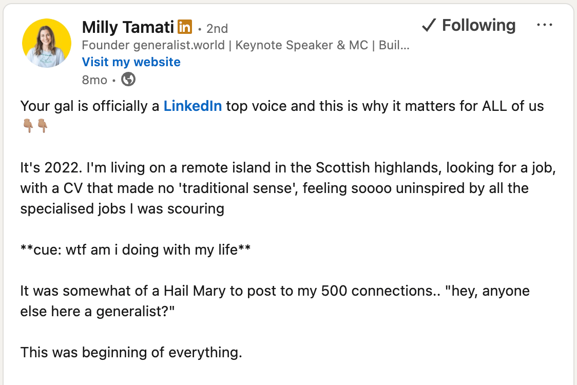 Milly didn't know if people like us existed. But she went to LinkedIn and started looking. DMing strangers. Browsing profiles. Asking people with squiggly career paths if they felt the same frustration. She found a handful. Put them in a Slack group. Then posted about it publicly.